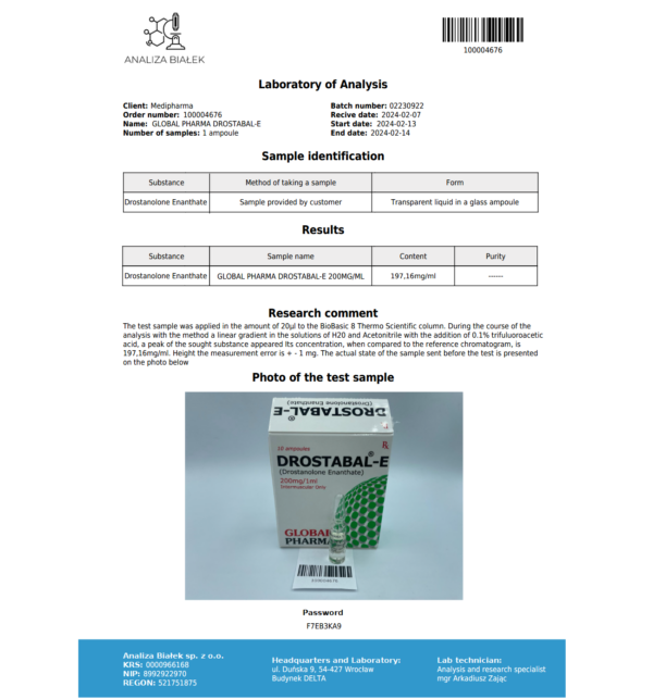 Global Pharma is een merk dat bekendstaat om strikte kwaliteitscontroles en GMP-gecertificeerde productie. Drostabal-E 200mg Masteron Enanthate wordt vervaardigd volgens de hoogste normen, waardoor gebruikers kunnen vertrouwen op de zuiverheid en consistentie van het product. Het merk heeft een solide reputatie binnen de anabolen- en onderzoekscommunity.